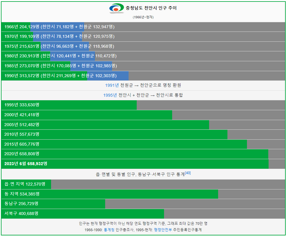 천안시 인구는 1966년 20만명 이었습니다. 그리고 2005년 처음으로 50만명을 돌파했고 이후 지속적으로 인구가 증가했습니다. 2023년 현재 65만명이 천안시에 거주하고 있습니다.