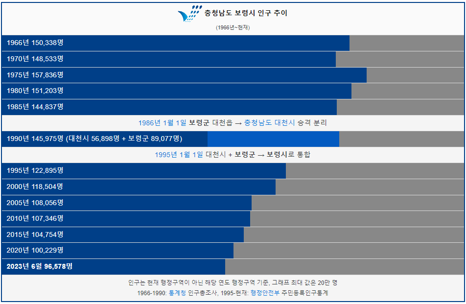 보령시 인구는 1966년 15만명 이었습니다. 그리고 1985년 인구가 처음으로 15만명 이하로 감소했고 이후에도 계속해서 인구가 감소했습니다. 2023년 현재 9만명이 보령시에 거주하고 있습니다.
