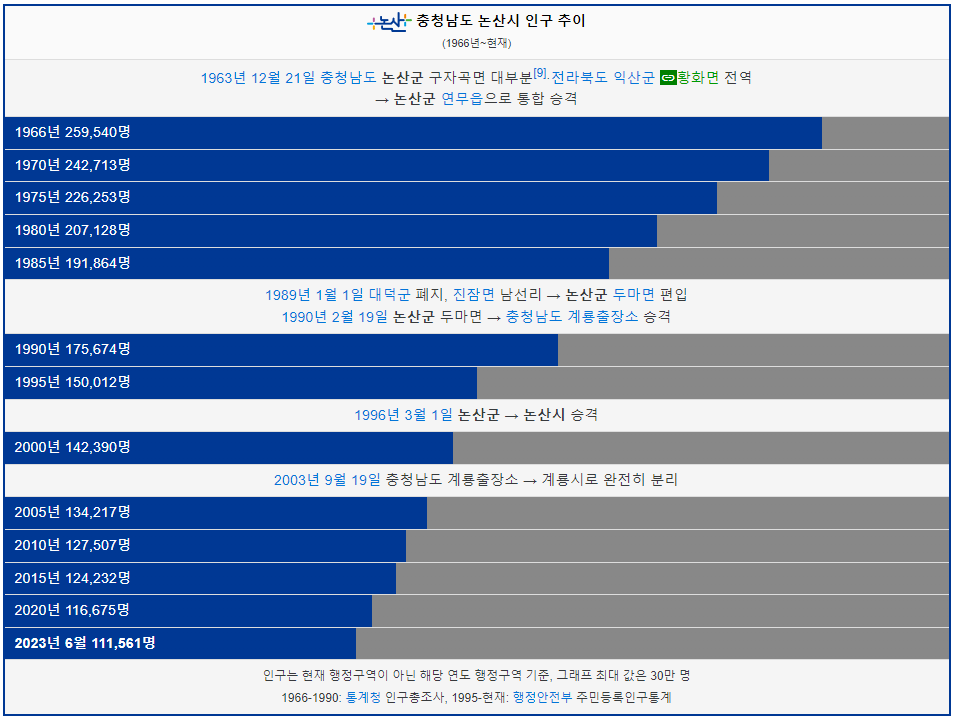 논산시 인구는 1966년 25만명 이었습니다. 그리고 2000년 인구가 처음으로 15만명 이하로 감소했고 이후에도 인구가 꾸준히 감소했습니다. 2023년 현재 11만명이 논산시에 거주하고 있습니다.