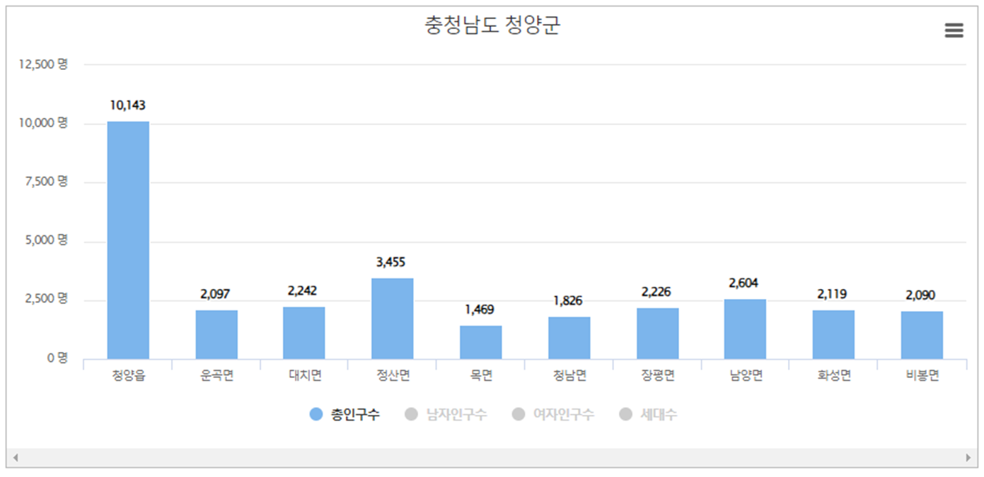 청양군에서 청양읍 인구가 가장 많으며 인구는 10,143명, 세대수는 5,458입니다. 두번째로는 정산면 인구가 많고 인구 3,455명, 세대수는 1,906입니다. 세번째는 남양면으로 인구는 2,604, 세대수는 1,497입니다.
