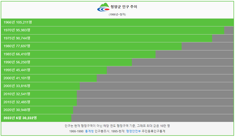 청양군 인구는 1966년 10만명 이었습니다. 그리고 1995년 처음으로 5만명 이하로 감소했고 이후로도 지속적으로 인구가 감소했습니다. 2023년 현재 3만명이 청양군에 거주하고 있습니다.