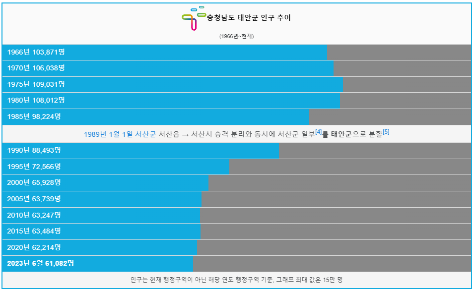 태안군 인구는 1966년 10만명 이었습니다. 그리고 1985년 처음으로 10만명 이하로 감소했고 이후로도 인구가 꾸준히 감소했습니다. 2023년 현재 6만명이 태안군에 거주하고 있습니다.