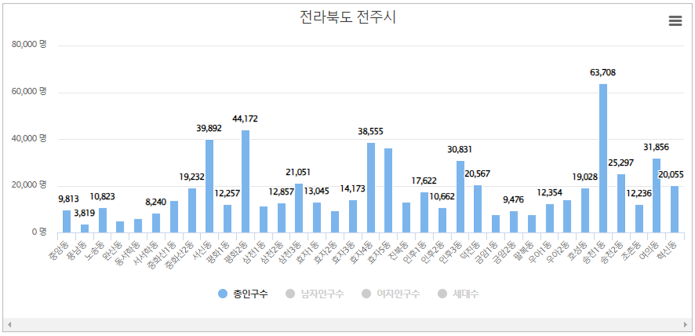 전주시에서 덕진구 송천1동 인구가 가장 많으며 인구는 63,708명, 세대수는 23,680입니다. 두번째로는 완산구 평화2동 인구가 많고 인구 44,172명, 세대수는 18,672입니다. 세번째는 완산구 서신동로 인구는 39,892, 세대수는 17,611입니다.