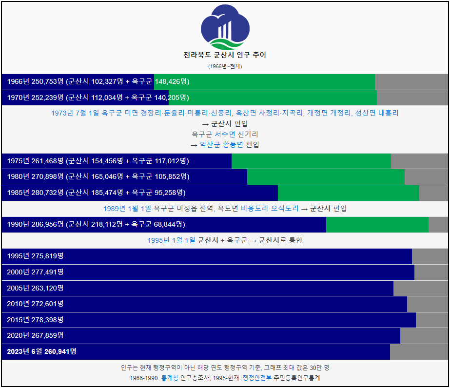군산시(군산시+옥구군) 인구는 1966년 25만명 이었습니다. 그리고 1990년 28만명으로 가장 많은 인구가 거주했고 이후 인구는 크게 감소하거나 증가하지 않았습니다. 2023년 현재 26만명이 군산시에 거주하고 있습니다.