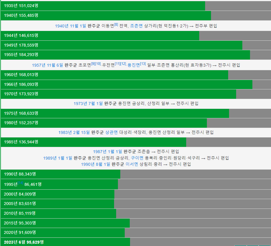 완주군 인구는 1935년 15만명 이었습니다. 그리고 1985년 인구가 처음으로 15만명 이하로 감소했고 이후 인구가 조금씩 감소했습니다. 2023년 현재 9만명이 완주군에 거주하고 있습니다.