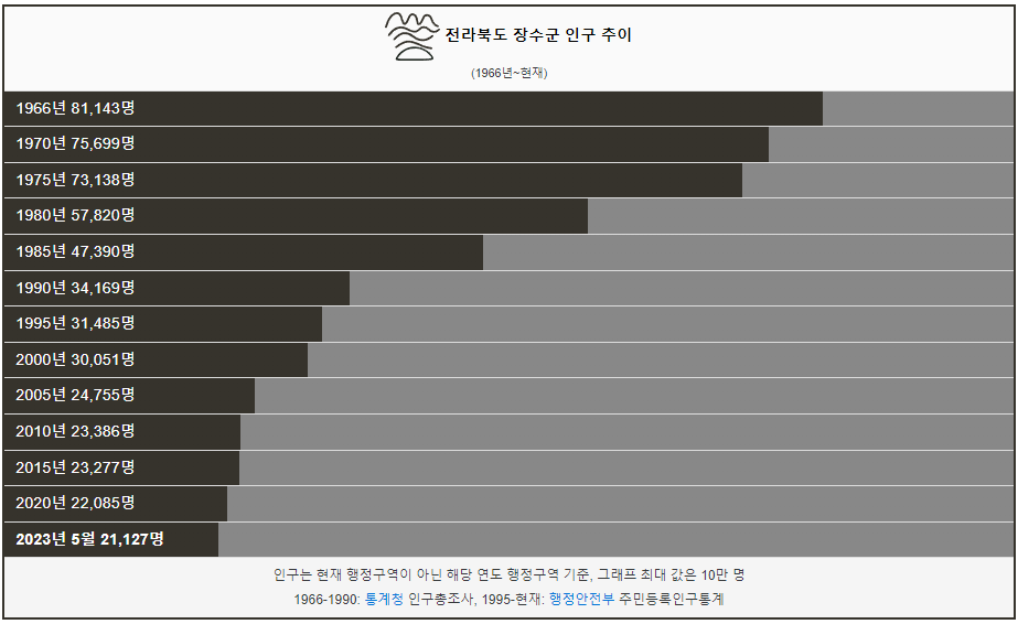 장수군 인구는 1966년 6만명 이었습니다. 그리고 1985년 처음으로 5만명 이하로 인구가 감소했고 이후로도 꾸준히 인구가 감소했습니다. 2023년 현재 2만명이 장수군에 거주하고 있습니다.