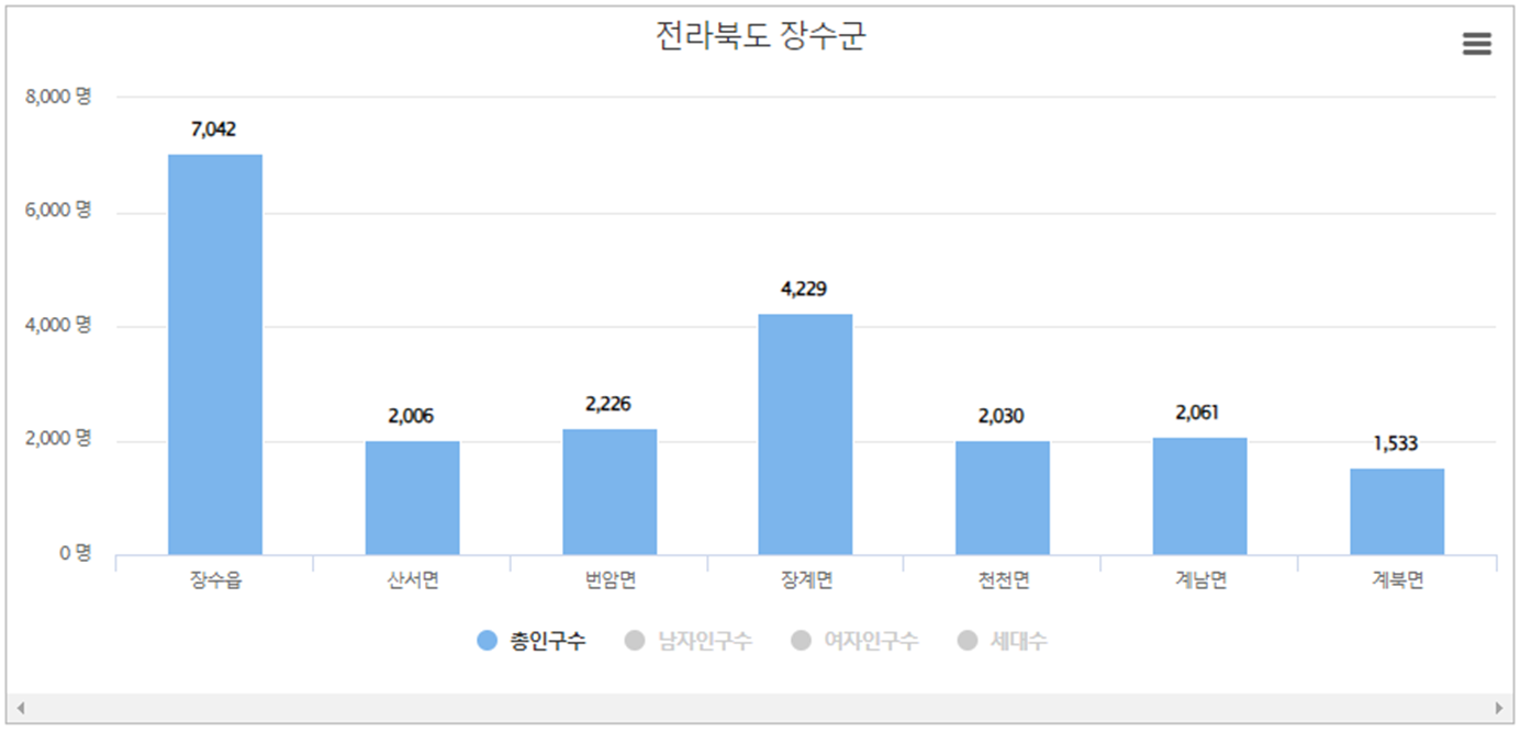 장수군에서 장수읍 인구가 가장 많으며 인구는 7,042명, 세대수는 3,550입니다. 두번째로는 장계면 인구가 많고 인구 4,229명, 세대수는 2,255입니다. 세번째는 번암면으로 인구는 2,226, 세대수는 1,336입니다.
