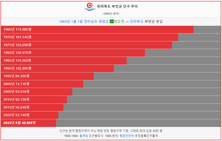 부안군 인구는 1966년 17만명 이었습니다. 그리고 1995년 처음으로 10만명 이하로 감소했고 이후로도 꾸준히 인구가 감소했습니다. 2023년 현재 5만명이 부안군에 거주하고 있습니다.