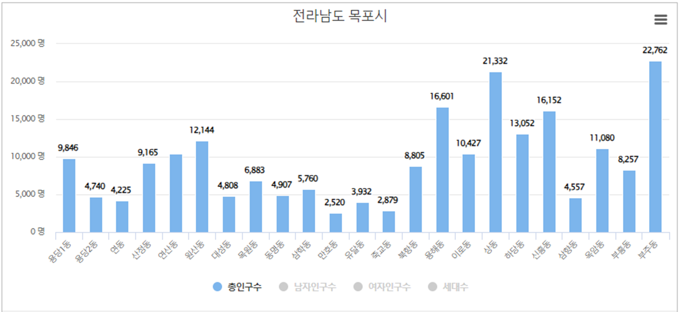 목포시에서 부주동 인구가 가장 많으며 인구는 22,762명, 세대수는 9,498입니다. 두번째로는 상동 인구가 많고 인구 21,332명, 세대수는 9,733입니다. 세번째는 용해동로 인구는 16,601, 세대수는 7,495입니다.