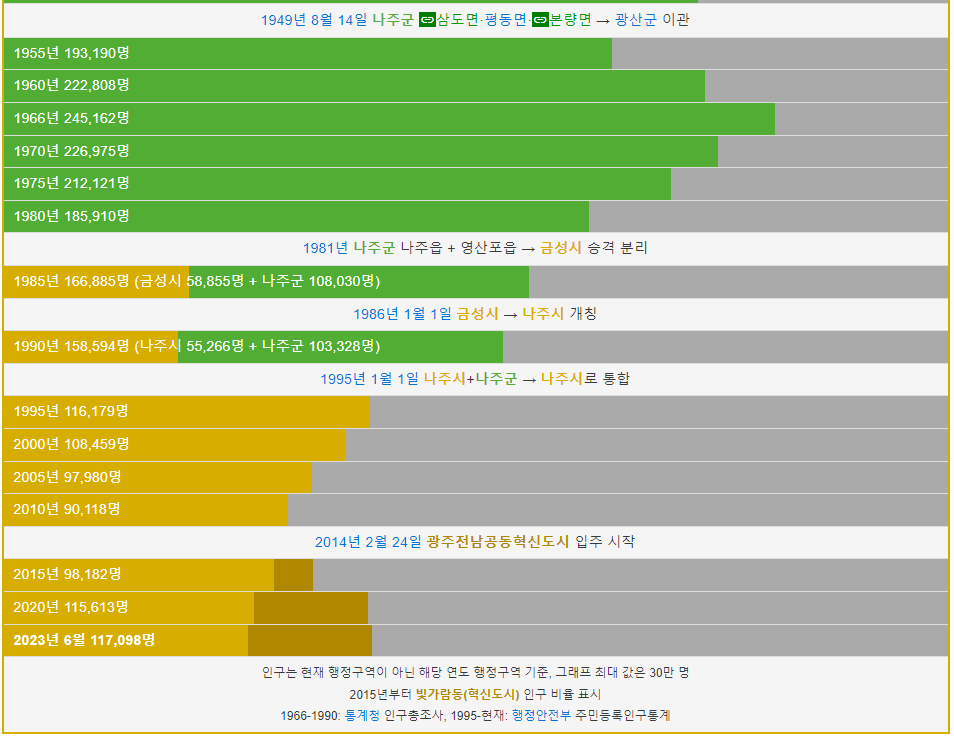 나주시 인구는 1955년 19만명 이었습니다. 그리고 1966년 24만명으로 가장 많은 인구가 거주했고 이후 인구가 계속해서 감소하다가 최근 빛가람혁신도시 입주로 인구가 다시 증가하고 있습니다. 2023년 현재 11만명이 나주시에 거주하고 있습니다.