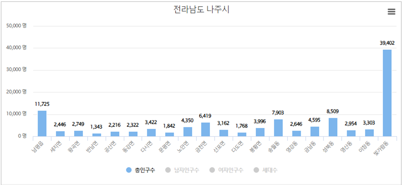 나주시에서 빛가람동 인구가 가장 많으며 인구는 39,402명, 세대수는 16,650입니다. 두번째로는 남평읍 인구가 많고 인구 11,725명, 세대수는 5,919입니다. 세번째는 성북동으로 인구는 8,509, 세대수는 4,127입니다.