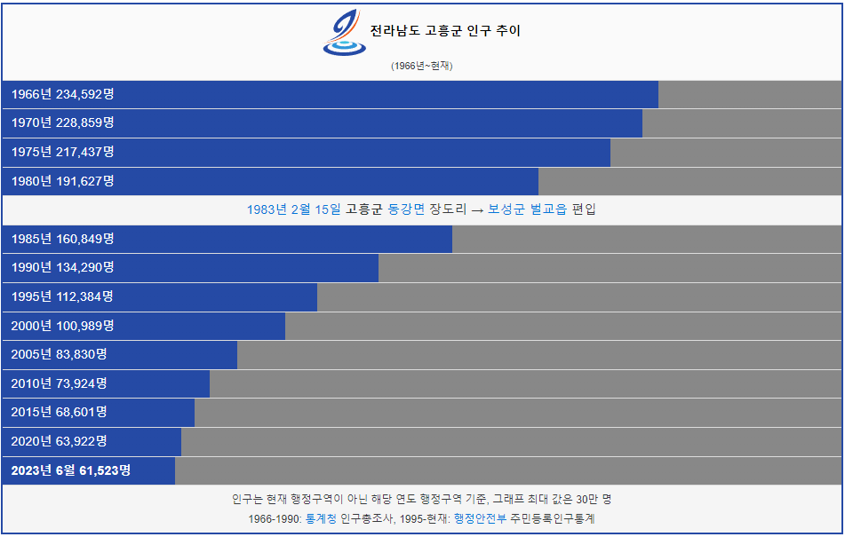 고흥군 인구는 1966년 23만명 이었습니다. 그리고 2005년 인구가 처음으로 10만명 이하로 감소했고 이후 인구가 계속해서 감소했습니다. 2023년 현재 6만명이 고흥군에 거주하고 있습니다.
