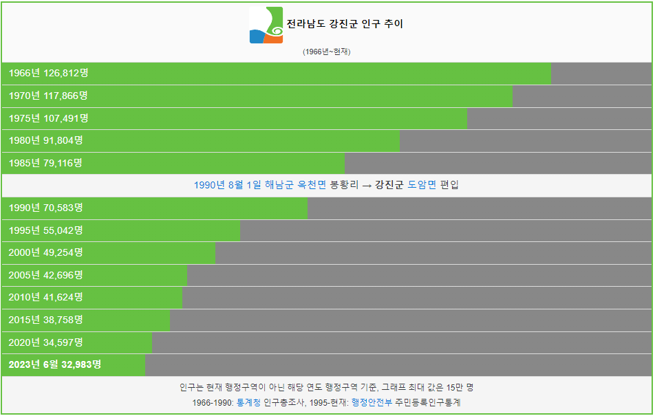 강진군 인구는 1966년 12만명 이었습니다. 그리고 1980년 인구가 처음으로 10만명 이하로 감소했고 이후 인구가 계속해서 감소했습니다. 2023년 현재 3만명이 강진군에 거주하고 있습니다.