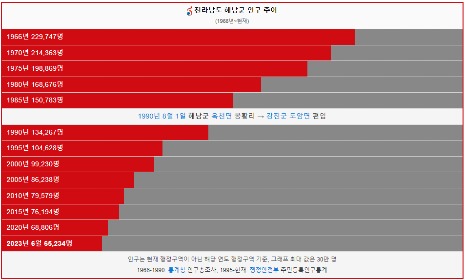 해남군 인구는 1966년 22만명 이었습니다. 그리고 2000년 인구가 처음으로 10만명 이하로 감소했고 이후 인구가 계속해서 감소했습니다. 2023년 현재 6만명이 해남군에 거주하고 있습니다.