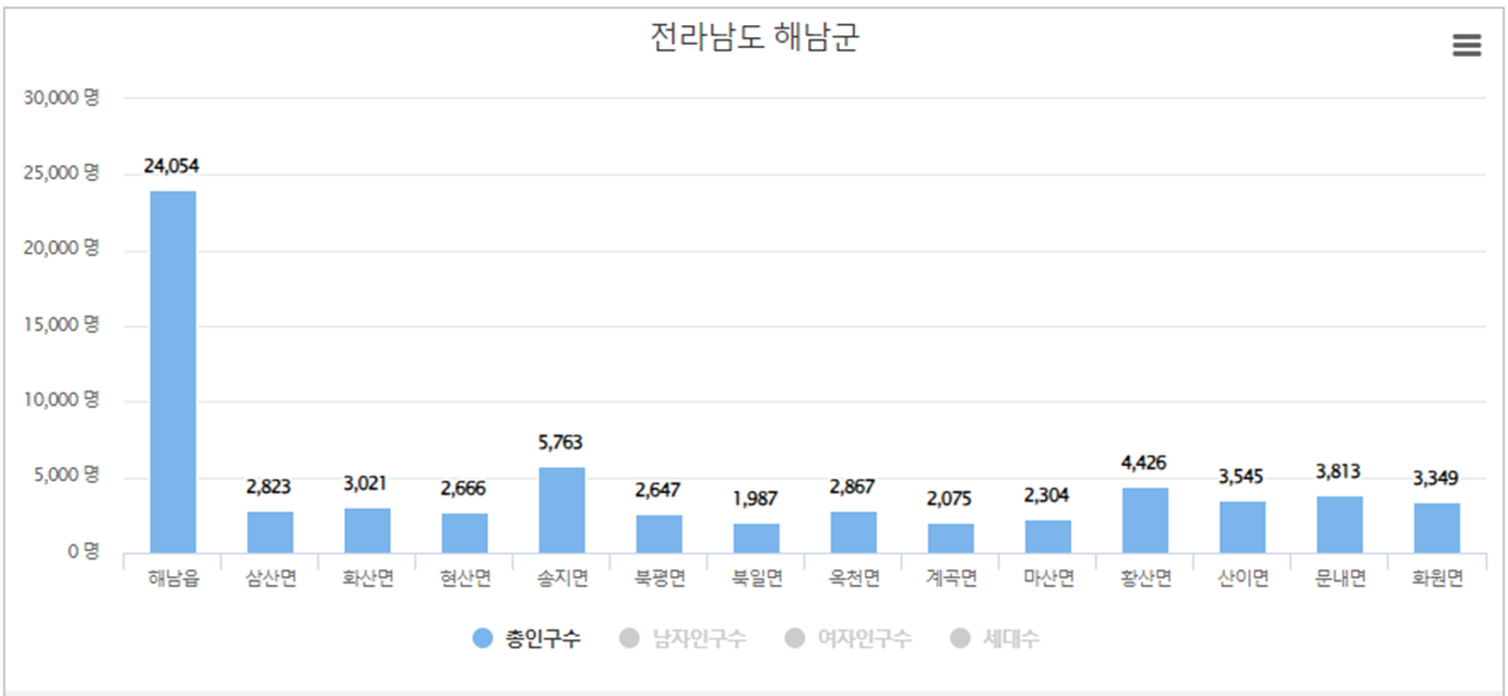 해남군에서 해남읍 인구가 가장 많으며 인구는 24,054명, 세대수는 11,222입니다. 두번째로는 송지면 인구가 많고 인구 5,763명, 세대수는 3,217입니다. 세번째는 황산면로 인구는 4,426, 세대수는 2,552입니다.