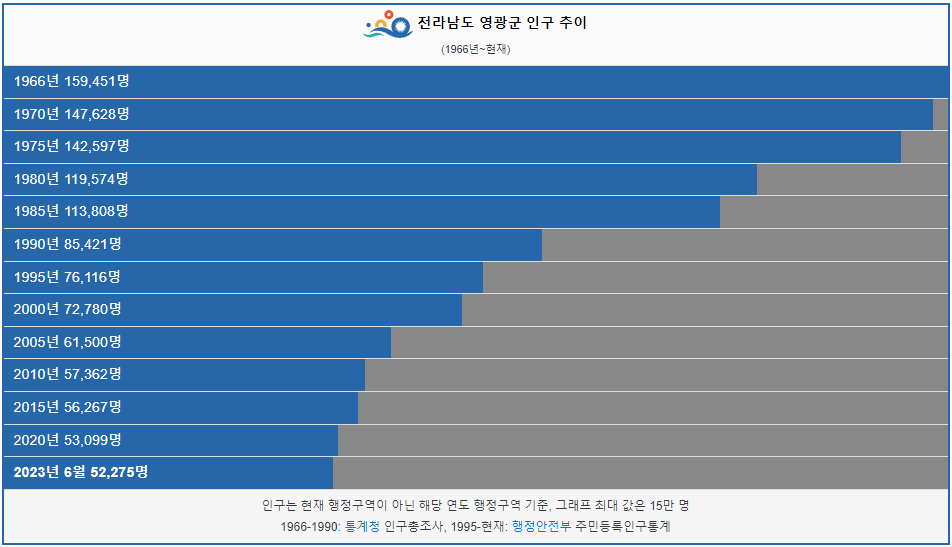 영광군 인구는 1966년 15만명 이었습니다. 그리고 1990년 인구가 처음으로 10만명 이하로 감소했고 이후 인구가 계속해서 감소했습니다. 2023년 현재 5만명이 영광군에 거주하고 있습니다.