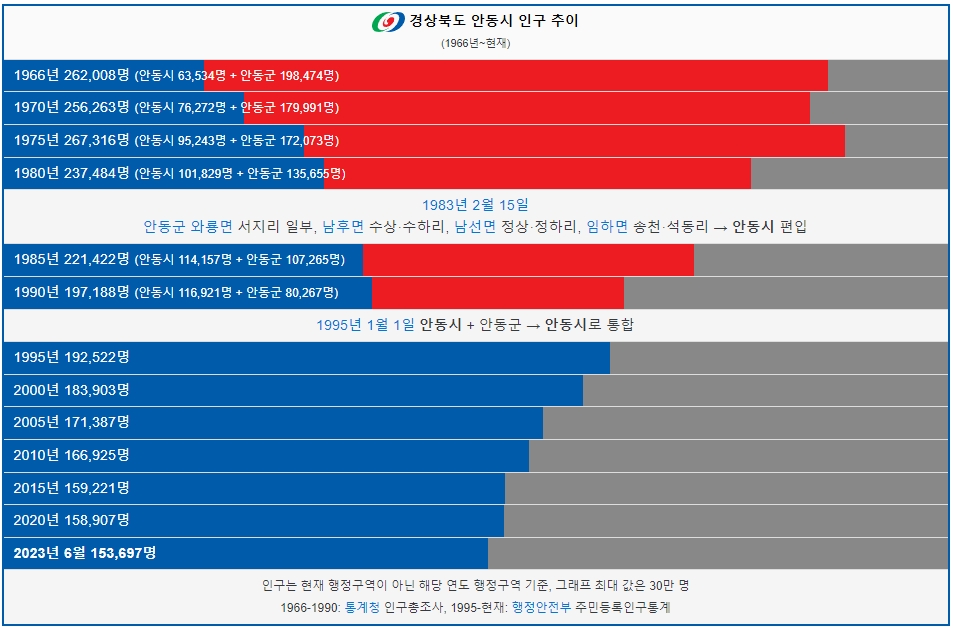안동시 인구는 1966년 26만명 이었습니다. 그리고 1990년 인구가 처음으로 20만명 이하로 감소했고 이후 인구가 계속해서 감소했습니다. 2023년 현재 15만명이 안동시에 거주하고 있습니다.