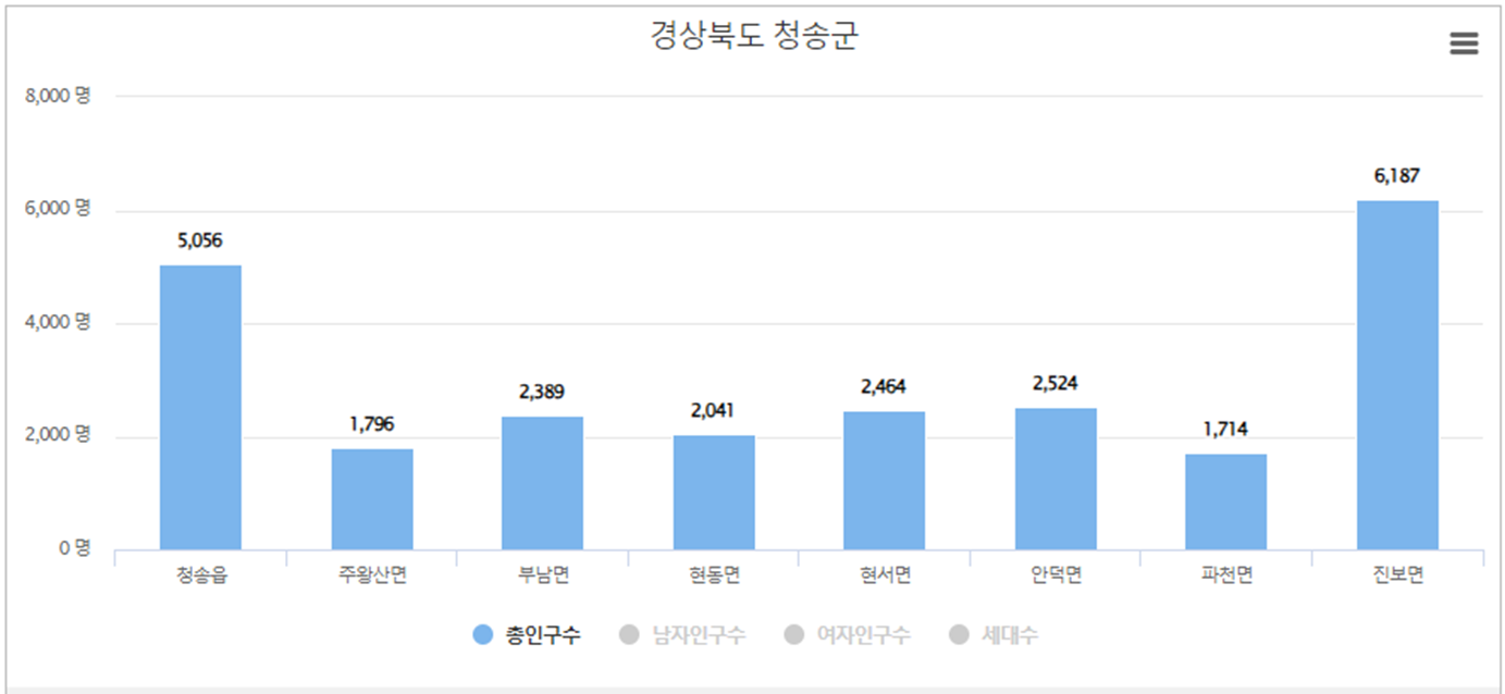 청송군에서 진보면 인구가 가장 많으며 인구는 6,187명, 세대수는 3,651입니다. 두번째로는 청송읍 인구가 많고 인구 5,056명, 세대수는 2,694입니다. 세번째는 안덕면으로 인구는 2,524, 세대수는 1,560입니다.