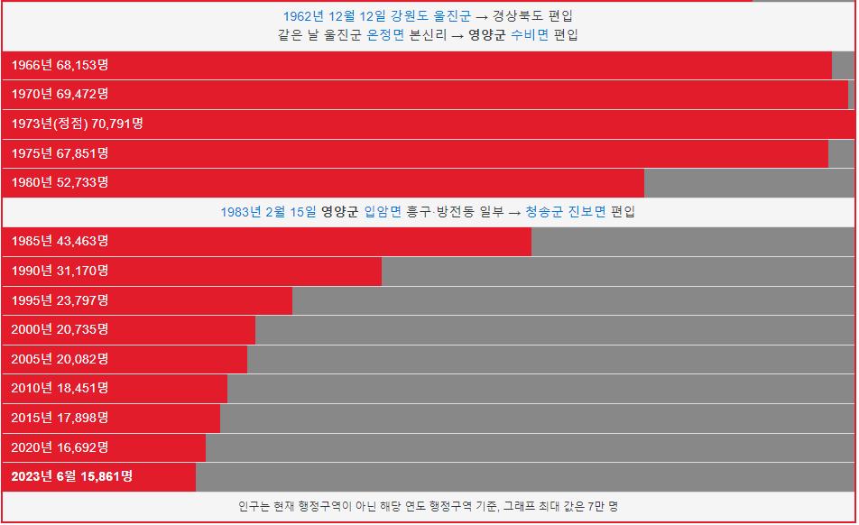 영양군 인구는 1966년 6만명 이었습니다. 그리고 1985년 인구가 처음으로 5만명 이하로 감소했고 이후 인구가 계속해서 감소했습니다. 2023년 현재 1만명이 영양군에 거주하고 있습니다.