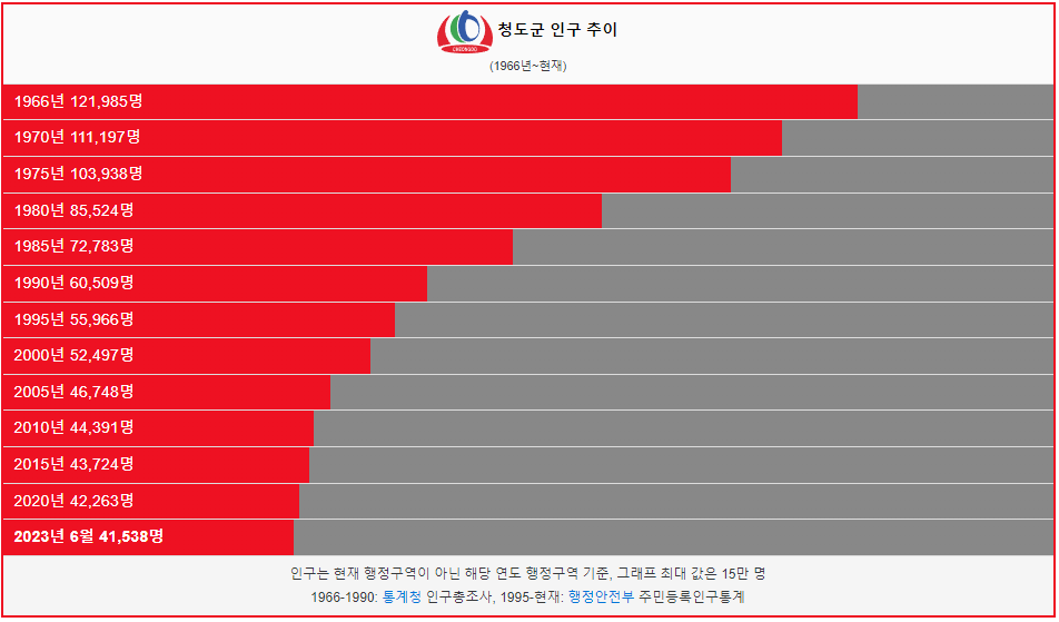 청도군 인구는 1966년 12만명 이었습니다. 그리고 2005년 인구가 처음으로 5만명 이하로 감소했고 이후 인구가 계속해서 감소했습니다. 2023년 현재 4만명이 청도군에 거주하고 있습니다.