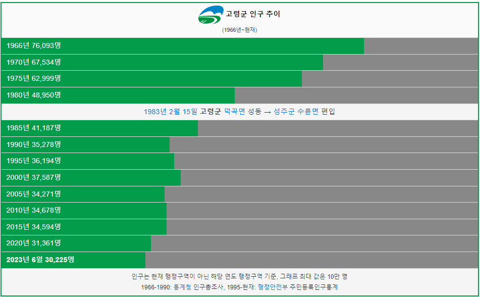 고령군 인구는 1966년 7만명 이었습니다. 그리고 1980년 인구가 처음으로 5만명 이하로 감소했고 이후 인구가 계속해서 감소했습니다. 2023년 현재 3만명이 고령군에 거주하고 있습니다.