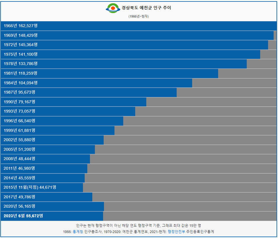 예천군 인구는 1966년 16만명 이었습니다. 그리고 1987년 인구가 처음으로 10만명 이하로 감소했고 이후 인구가 계속해서 감소했습니다. 2023년 현재 5만명이 예천군에 거주하고 있습니다.