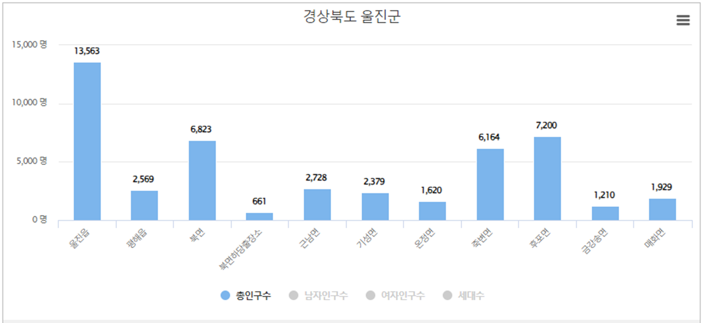 울진군에서 울진읍 인구가 가장 많으며 인구는 13,563명, 세대수는 6,280입니다. 두번째로는 후포면 인구가 많고 인구 7,200명, 세대수는 3,991입니다. 세번째는 북면으로 인구는 6,823, 세대수는 3,518입니다.