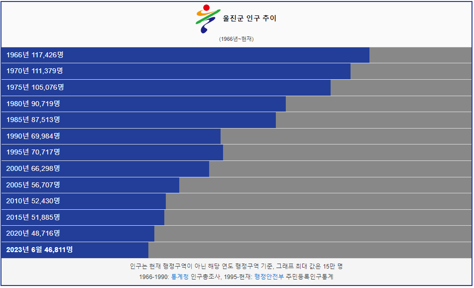 울진군 인구는 1966년 11만명 이었습니다. 그리고 1980년 인구가 처음으로 10만명 이하로 감소했고 이후 인구가 계속해서 감소했습니다. 2023년 현재 4만명이 울진군에 거주하고 있습니다.
