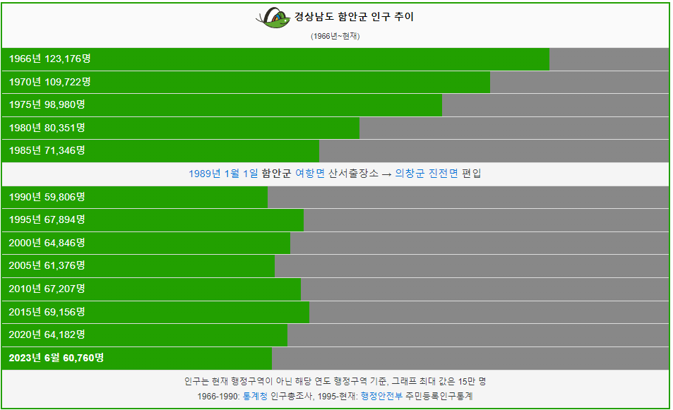 함안군 인구는 1966년에 12만 3176명으로 가장 많았습니다. 그 이후 지속적으로 하락하였으며 1975년 처음으로 10만명 이하로 인구가 줄었습니다. 2023년 현재 6만 760명이 함안군에 거주하고 있습니다.