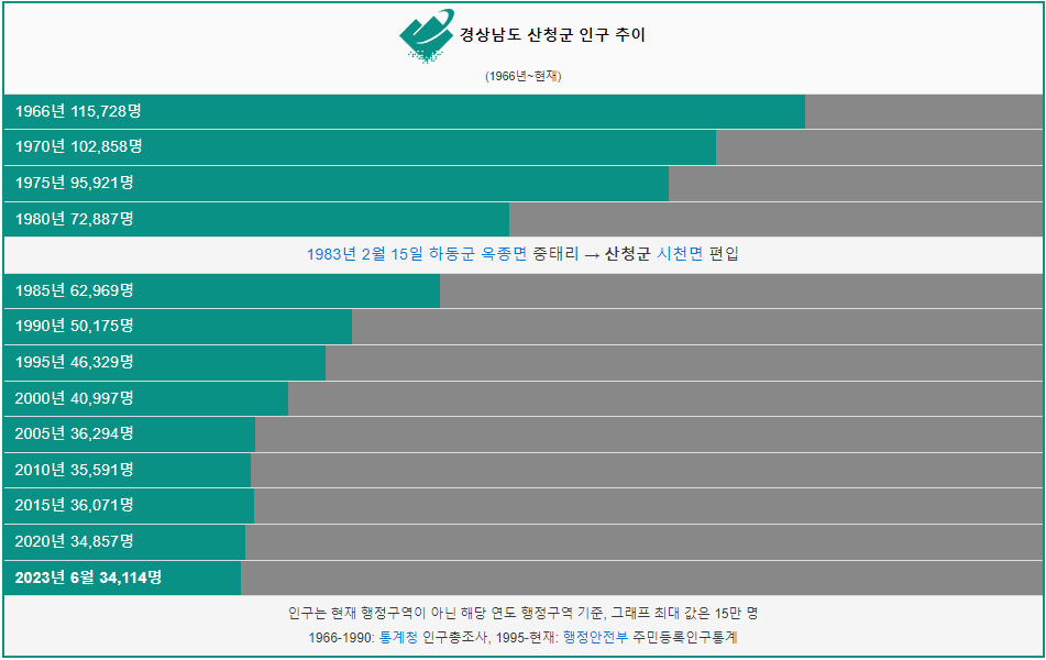 산청군 인구는 1966년 11만 5728명으로 가장 많았습니다. 그 이후 지속적으로 하락하였으며 1975년 처음으로 10만명 이하로 인구가 줄었습니다. 2023년 현재 3만 4114명이 산청군에 거주하고 있습니다.