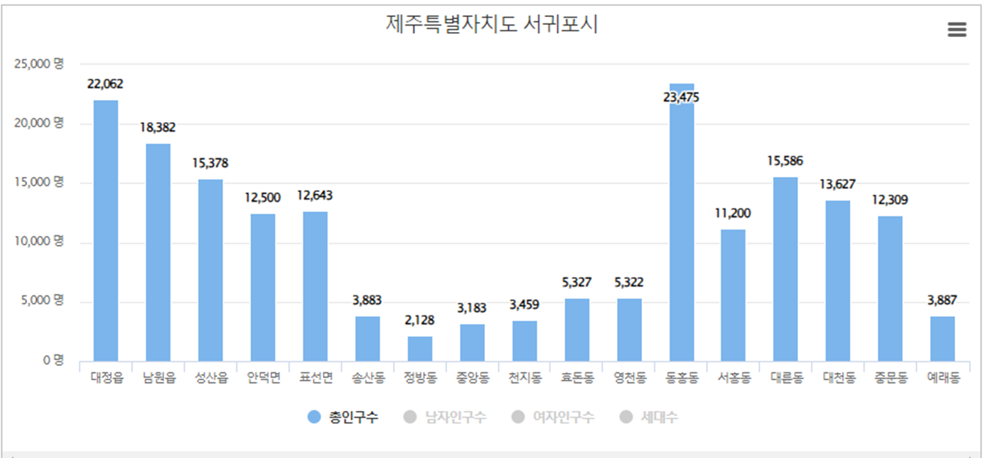 서귀포시에서 동홍동이 인구가 가장 많으며 인구는 23,475명, 세대수는 10,013입니다. 두번째로는 대정읍 인구가 많고 인구 22,062명, 세대수는 10,842입니다. 세번째는 남원읍으로 인구는 18,382, 세대수는 8,832입니다.