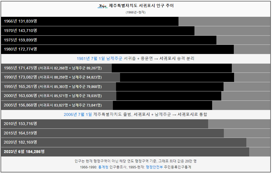 서귀포시 인구는 1966년에 131,839명으로 15만명이 안됐지만 약 10년 후인 1975년에 15만명을 돌파했고 현재 184,286명으로 거의 20만명에 육박하고 있습니다.