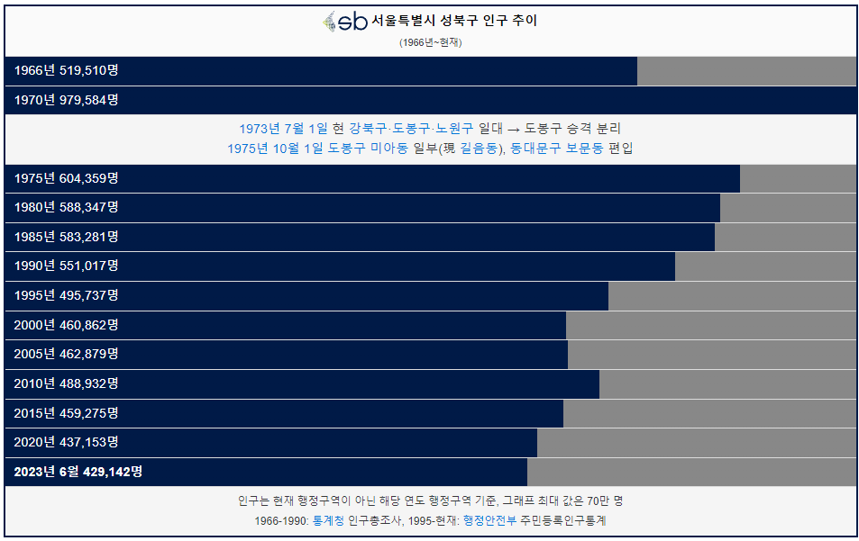 성북구 인구는 1966년 51만명 이었습니다. 그리고 1970년 인구 97만명으로 인구가 가장 많았고 이후 강북구, 도봉구, 노원구 일대가 도봉구로 승격 분리되었습니다. 이후 인구가 꾸준히 감소하였습니다. 2023년 현재 42만명이 성북구에 거주하고 있습니다.