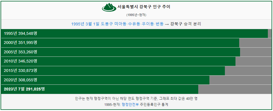 강북구 인구는 1995년 39만명 이었습니다. 그리고 2010년 인구가 처음으로 30만명 이하가 됐고 이후에도 인구가 꾸준히 감소했습니다. 2023년 현재 29만명이 강북구에 거주하고 있습니다.