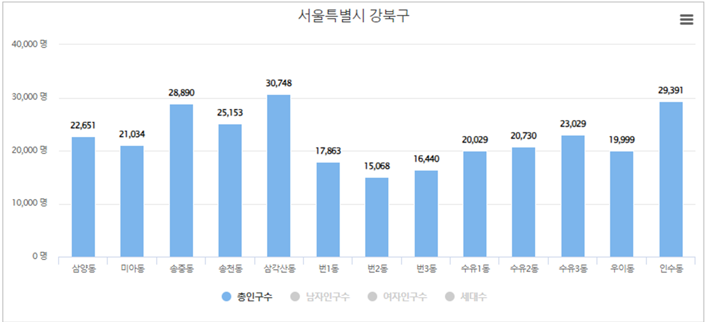 강북구에서 삼각산동이 인구가 가장 많으며 인구는 30,748명, 세대수는 11,550입니다. 두번째로는 인수동 인구가 많고 인구 29,391명, 세대수는 14,260입니다. 세번째는 송중동으로 인구는 28,890, 세대수는 13,937입니다.