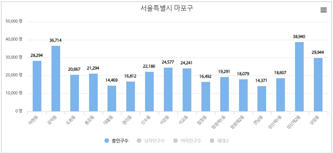 마포구 인구는 1966년 30만명 이었습니다. 그리고 1985년 인구 44만명 이상이 됐고 이후 인구가 꾸준히 감소했습니다. 2023년 현재 36만명이 마포구에 거주하고 있습니다.