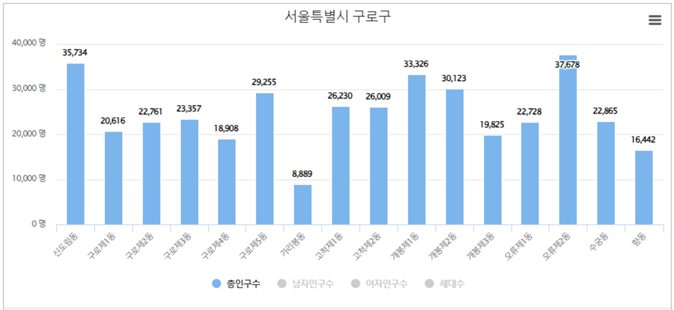 구로구에서 오류제2동이 인구가 가장 많으며 인구는 37,678명, 세대수는 15,828입니다. 두번째로는 신도림동 인구가 많고 인구 35,734명, 세대수는 13,993입니다. 세번째는 개봉제1동으로 인구는 33,326, 세대수는 14,989입니다.