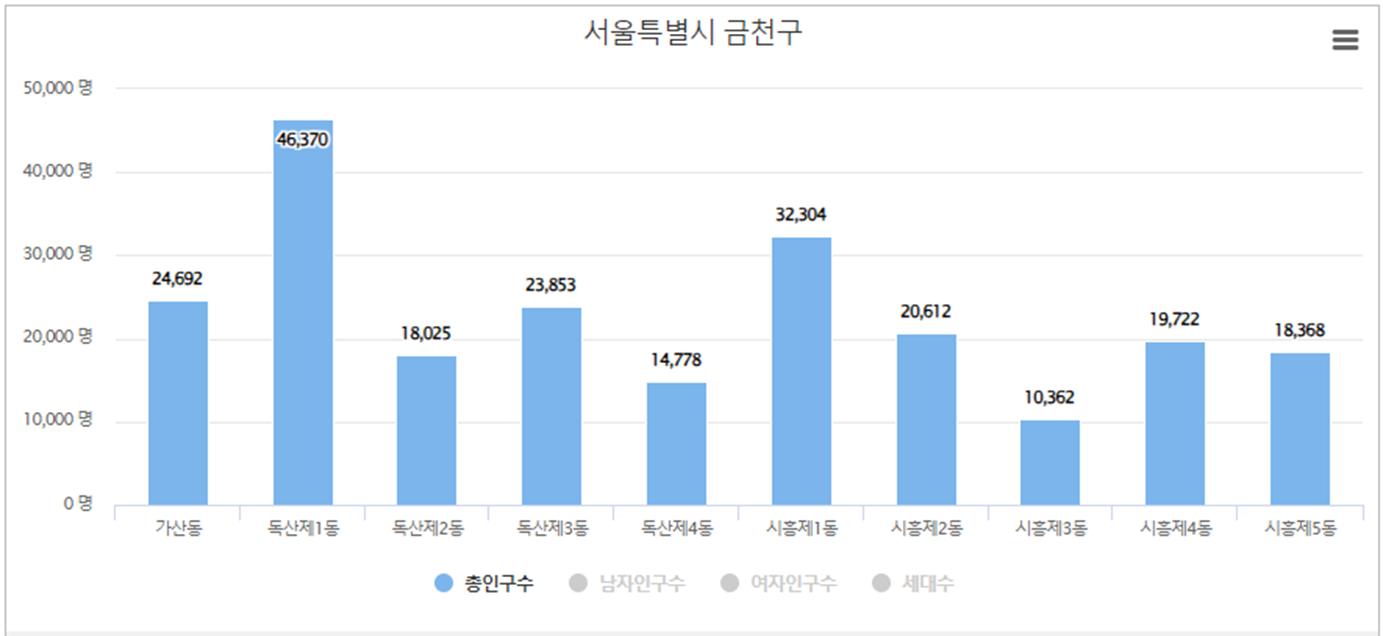 금천구에서 독산제1동이 인구가 가장 많으며 인구는 46,370명, 세대수는 24,990입니다. 두번째로는 시흥제1동 인구가 많고 인구 32,304명, 세대수는 16,362입니다. 세번째는 가산동으로 인구는 24,692, 세대수는 18,012입니다.