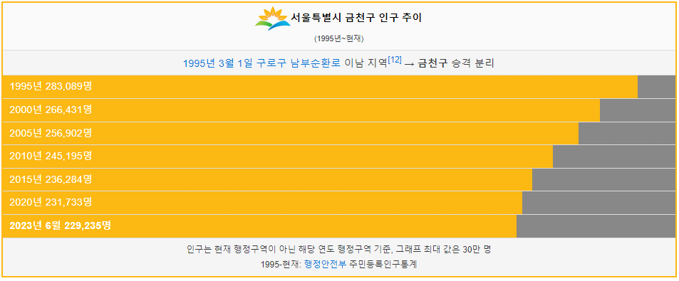 금천구 인구는 1995년 28만명으로 가장 많은 인구가 거주했습니다. 이후 인구가 꾸준히 감소했습니다. 2023년 현재 22만명이 금천구에 거주하고 있습니다.