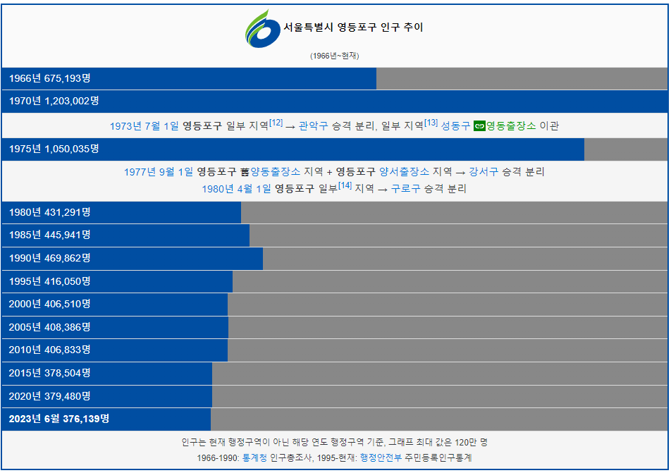 영등포구 인구는 1966년 67만명 이었습니다. 그리고 1970년 인구 120만명으로 가장 많은 인구가 거주했고 이후 구의 일부가 관악구와 강서구, 구로구로 승격 분리되면서 인구가 줄었습니다. 이후 인구가 꾸준히 감소했습니다. 2023년 현재 37만명이 영등포구에 거주하고 있습니다.