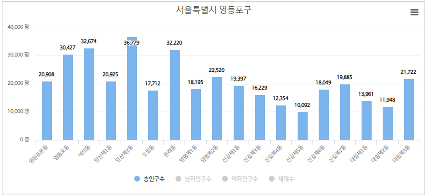 영등포구에서 당산제2동이 인구가 가장 많으며 인구는 36,779명, 세대수는 18,924입니다. 두번째로는 여의동 인구가 많고 인구 32,674명, 세대수는 13,402입니다. 세번째는 문래동으로 인구는 32,220, 세대수는 13,182입니다.
