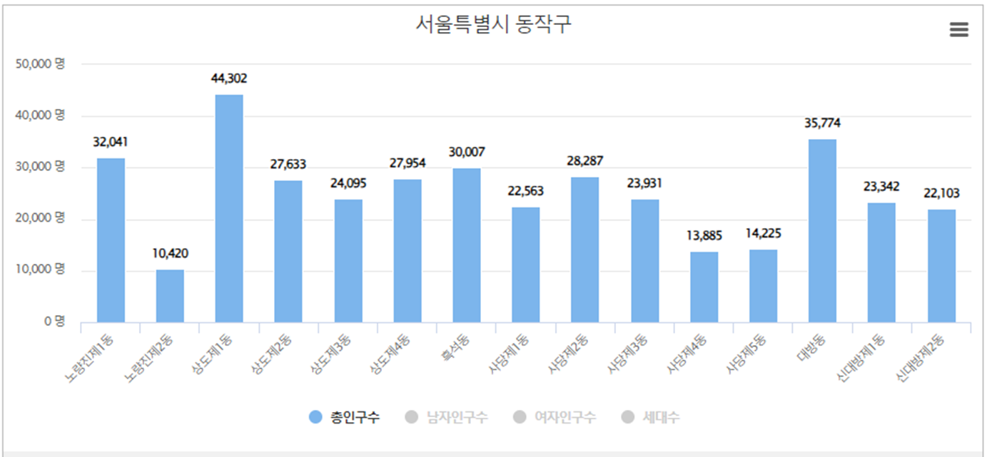 동작구에서 상도제1동이 인구가 가장 많으며 인구는 44,302명, 세대수는 22,592입니다. 두번째로는 대방동 인구가 많고 인구 35,774명, 세대수는 16,695입니다. 세번째는 노량진제1동으로 인구는 32,041, 세대수는 16,827입니다.