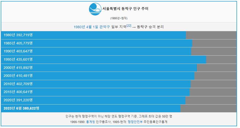 동작구 인구는 1980년 39만명 이었습니다. 그리고 1995년 인구 43만명으로 가장 많은 인구가 거주했고 이후 인구가 꾸준히 감소했습니다. 2023년 현재 38만명이 동작구에 거주하고 있습니다.