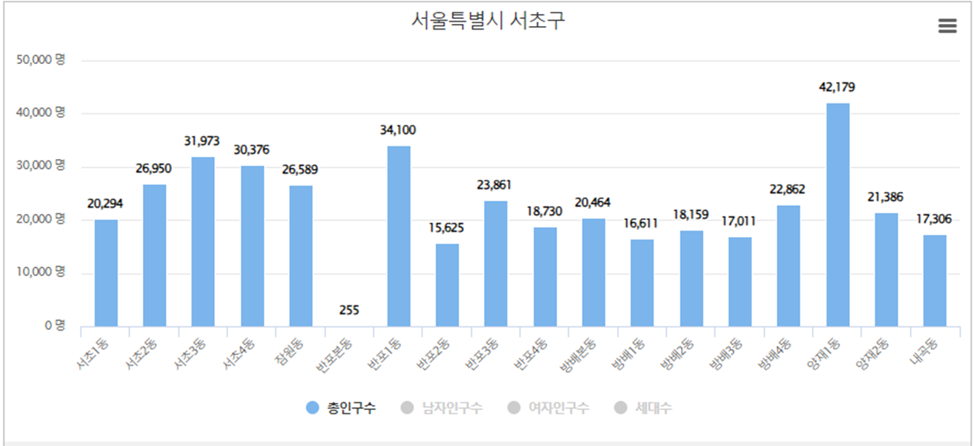 서초구에서 양재1동이 인구가 가장 많으며 인구는 42,179명, 세대수는 17,853입니다. 두번째로는 반포1동 인구가 많고 인구 34,100명, 세대수는 14,792입니다. 세번째는 서초3동으로 인구는 31,973, 세대수는 15,291입니다.