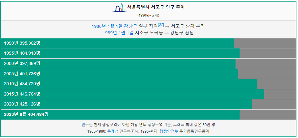 서초구 인구는 1990년 39만명 이었습니다. 그리고 2015년 인구 44만명으로 가장 많은 인구가 거주했고 이후 인구가 꾸준히 감소했습니다. 2023년 현재 40만명이 서초구에 거주하고 있습니다.