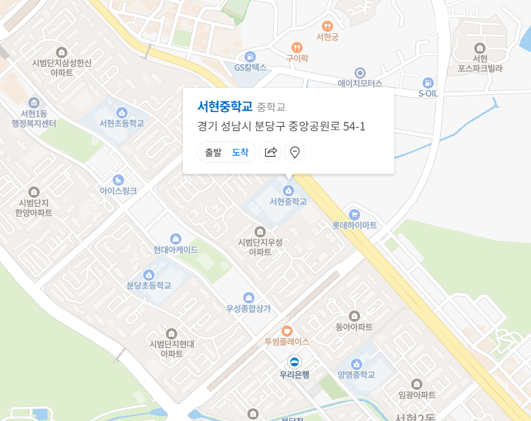 성남시에서 특목고에 가장 많이 진학한 학교는 서현중학교로 경기도 성남시 분당구 중앙공원로 54-1번지에 위치합니다. 서현중학교의 학생수는 398명이며 과학고는 2명, 외고는 15명, 자사고에는 8명이 진학했습니다. 서현중학교의 전체 학생 중 6.28%인 25명이 특목고에 진학했습니다.