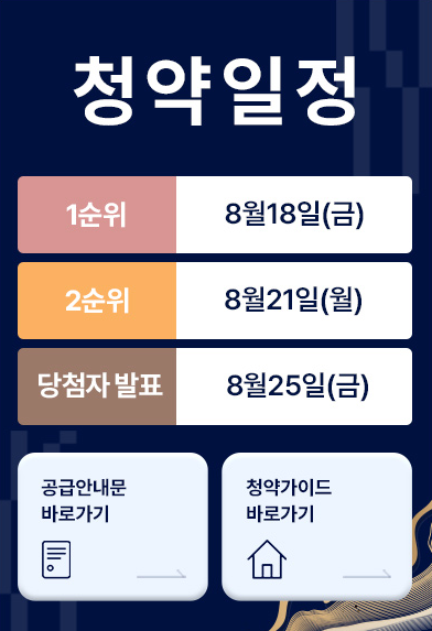 청약 일정은 오는 18일 1순위, 21일 2순위 접수를 하며, 당첨자는 25일 발표합니다. 발표 후 정당계약은 9월 5일부터 사흘간 진행됩니다.