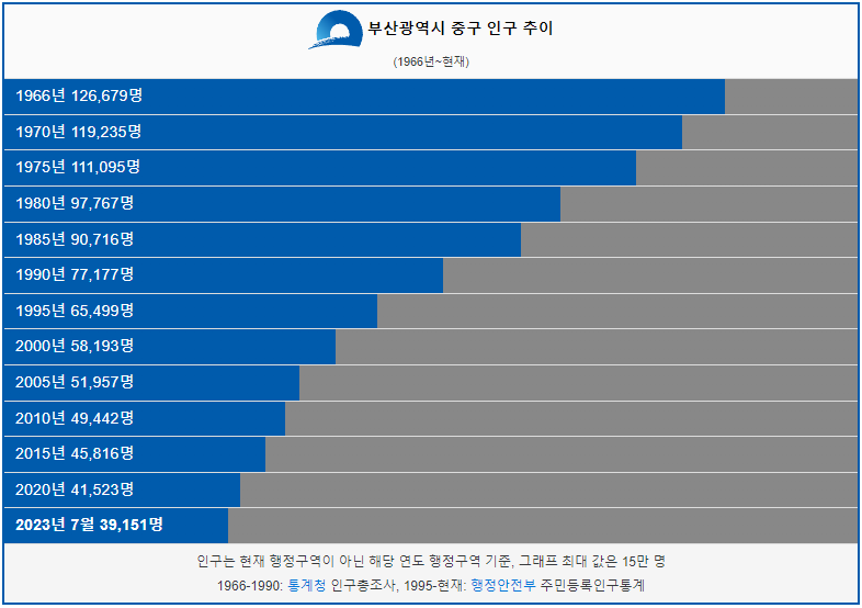 중구 인구는 1966년 12만명 이었습니다. 그리고 1980년 인구가 처음으로 10만명 이하로 감소했고 이후에도 인구가 꾸준하게 감소했습니다. 2023년 현재 3만 9천명이 중구에 거주하고 있습니다.