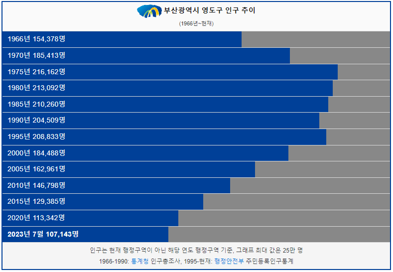 영도구 인구는 1966년 15만명 이었습니다. 이후 1975년 20만명 돌파 후 2000년에 다시 인구가 20만명 이하로 감소했고 이후에도 인구가 꾸준하게 감소했습니다. 2023년 현재 10만명이 영도구에 거주하고 있습니다.