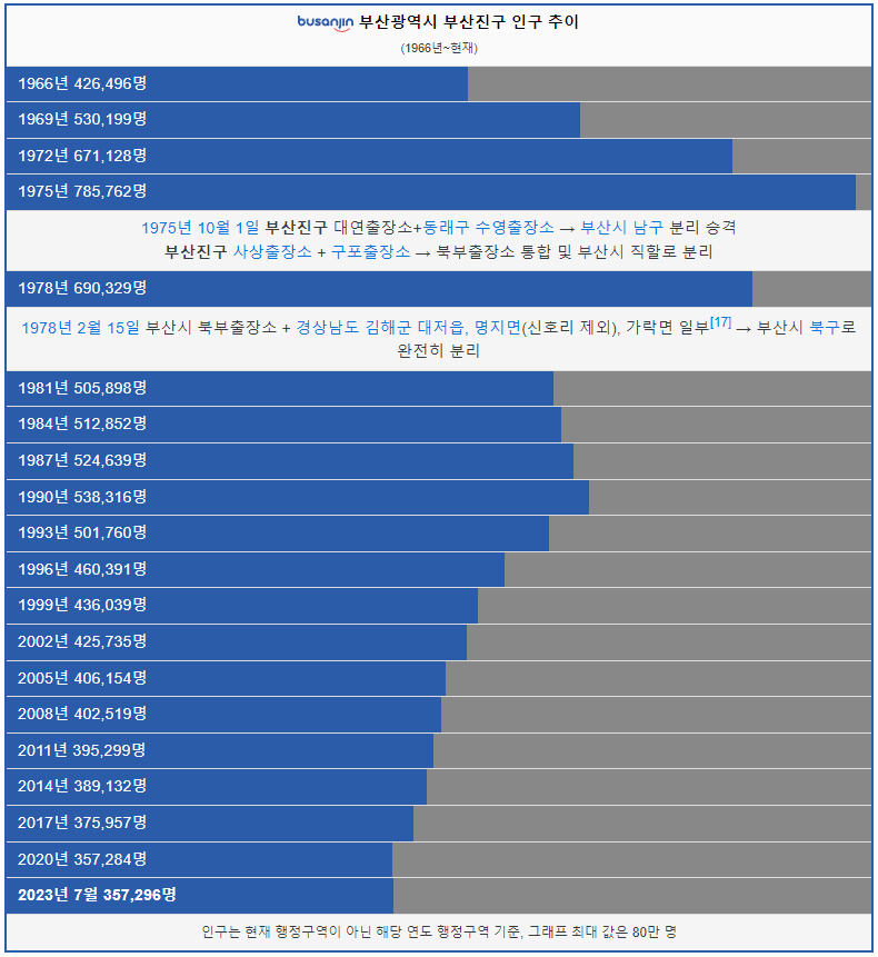 부산진구 인구는 1966년 42만명 이었습니다. 그리고 1996년 인구가 처음으로 50만명 이하로 감소했고 이후에도 인구가 꾸준하게 감소했습니다. 2023년 현재 35만명이 부산진구에 거주하고 있습니다.
